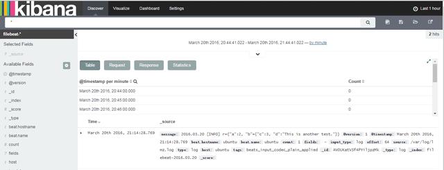 目前我们先忽略这部分的内容,点击左上角的Discover页签,在被监控的日志中添加新的一行并保存,就会看到日志中的信息: