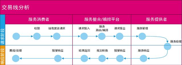 在服务治理的过程中原来的核心业务系统被打碎为各种独立的业务组件,一些中间层平台型系统基于这些业务组件和流程服务逐渐构建了业务服务,并成为前端应用的快速构建提供业务支撑。在这个过程中服务识别和构建是基础,交易线的规范是保障,通过交易线规范可以确定服务治理有所为,有所不为,这是因为随软件版本迭代,很少有个人能把系统的全部细节都考虑清楚,所以要以规则治理,而不是人治。