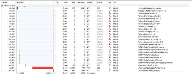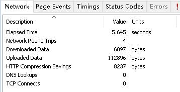从统计信息可以看到:总计请求耗时5.645秒,进行4次网络交互,接收5.9KB数据。发送110.25KB数据,GZIP压缩节省了:8KB数据。