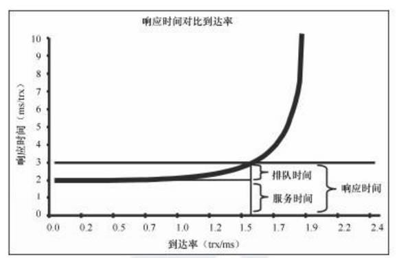 纵轴是响应时间。响应时间是服务时间和排队时间的总和。横轴是到达率。随着每单位时间进入系统事务数的递增,曲线随之向右滑动。随着到达率的继续增加,在某一时候,排队时间将陡然上升。当这种情况发生时,响应时间也将陡然上升,性能下降,而用户感到非常沮丧。
