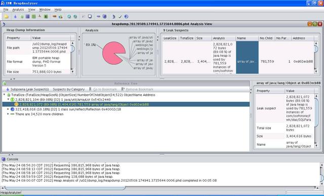 【案例】应用服务器运行一段Object实例数量达百万/千万级别,使用IBMHeapAnalyzer分析内存溢出时生成heapdump文件,发现89.1%的空间被基础对象占用(为从数据库加载大量记录导致):