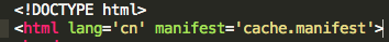 <!DOCTYPE html><html lang='cn' manifest='cache.manifest'><head><meta http-equiv="Content-Type" content="text/html; charset=UTF-8"><title>离线缓存示例页面</title><!-- CSS文件引用 --></head><body><!-- 各种标签 --></body><!-- 各种脚本文件 --></html>