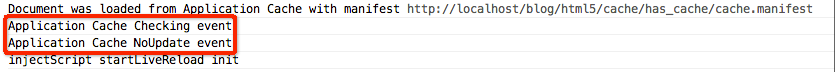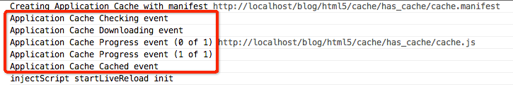 同时修改了cache.manifest文件(随便在注释里添加几个数字即可)。之前已经设置了20s后,调用update方法检查缓存资源是否更新,此时浏览器发现cache.manifest文件发生变化,且cache.js的确被修改的,于是毫不犹豫地更新了本地缓存。