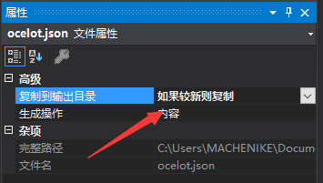 在项目中,添加一个配置文件 ocelot.json ,并将文件属性中 “赋值到输出目录” 的值修改为 “如果较新则复制”。
