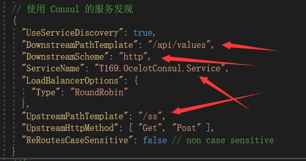 "UseServiceDiscovery": false //使⽤用服务发现,⽬目前Ocelot只⽀支持Consu l的服务发现