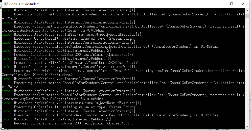 我们开始部署集群,回车!,发现诸多的代码在执行,如下图所示,这是我们通过consul的命令去扫描了tmp/consul/config/ 这里面的json,当然它只认识json,读取其中的节点,通过Consul的自动代理HttpClient注册我们的服务,那么这就是一个通俗易懂的解释了。