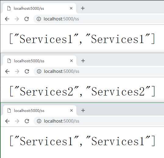 其中的DownstreamPathTemplate是向下的模板路径,DownstreamScheme是访问的方式,有http和https,ServiceName是服务发现的路径,在此其中,你的配置文件中,如果和这个名字相同,那么就会根据对应的address和port 去访问DownStreamPathTemplate,那么UpstreamPathTemplate是你要写的别名,也就是说我们的台服务器无法达到匹配的时候,我们可以使用这个属性(类似我们访问www.baidu.com 第一次访问和这个ServiceName相同的服务,第二次找第二个,当然这和Type:"RoundRobin" 这个属性有极大的关联,这个就叫做轮询,这个属性是Ocelot的精髓)。我们分别通过网关地址和服务的真实地址来访问服务,看一看效果如何。