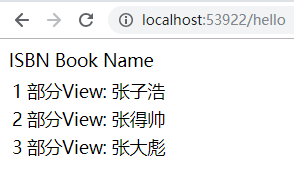 <table> <tr> ISBN </tr> <tr> Book Name </tr> <tbody> @Each.list <tr> <td> @Current.StudentID </td> <td> @Partial['Partial.html',Model.StudentName] </td> </tr> @EndEach </tbody> </table>