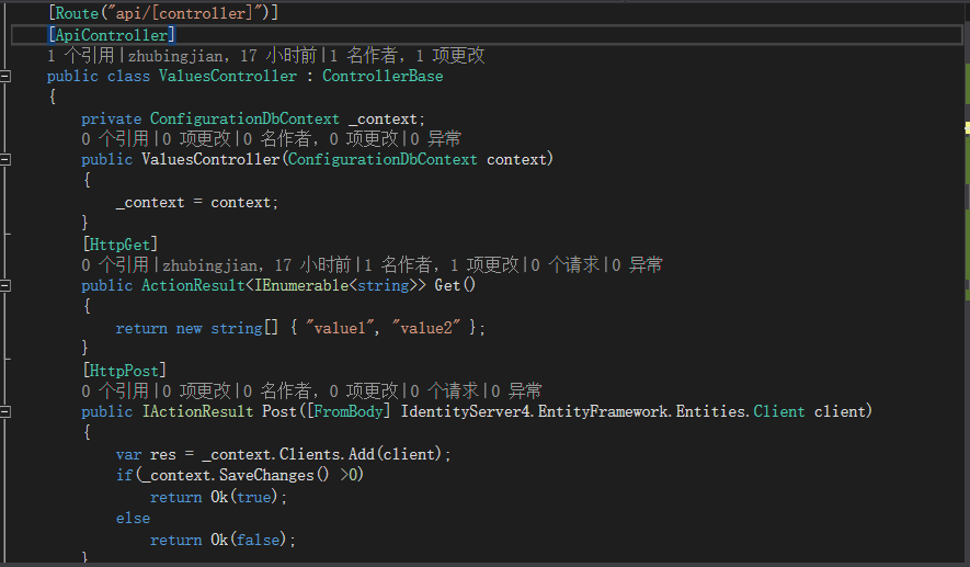 在ValuesController控制器中注入ConfigurationDbContext上下文,此上下文可用来加载或配置IdentityServer4.EntityFramework的Client、身份信息、API资源信息或CORS数据等。