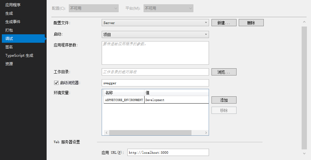(5)在项目属性->调试 中,启动浏览器,并设成swagger,如图: