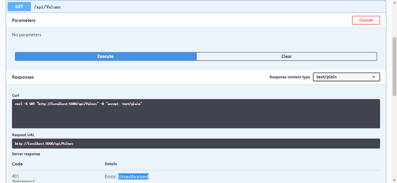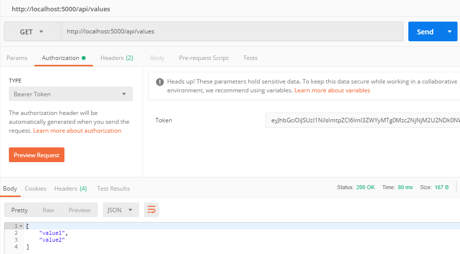 client.SetBearerToken(tokenResponse.AccessToken); var response = await client.GetAsync("http://localhost:5000/api/values/"); if (!response.IsSuccessStatusCode)