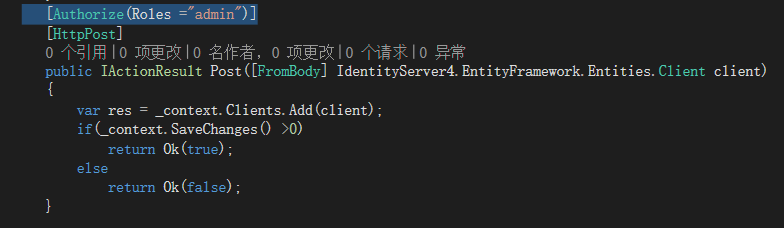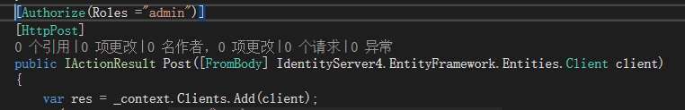 最后运行程序,成功地在[Authorize(Roles ="admin")]权限下访问并新增了Client。
