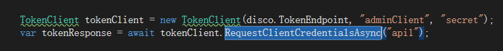 TokenClient tokenClient = new TokenClient(disco.TokenEndpoint, "Client", "secret"); var tokenResponse = await tokenClient.RequestClientCredentialsAsync("api1"); if (tokenResponse.IsError)