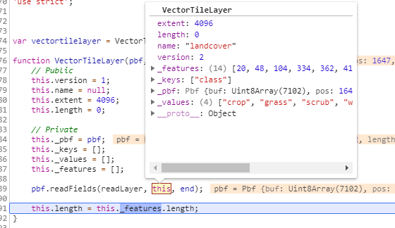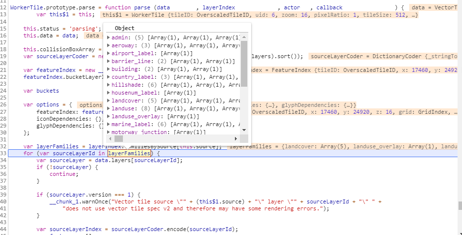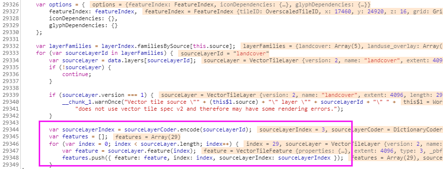 这里是VectorTile中的一个VectorTileLayer读取到的二进制字段;这里的解析是把二进制转化成js对象,里面的数据还需要进一步转换成可用的几何数据和属性数据。
