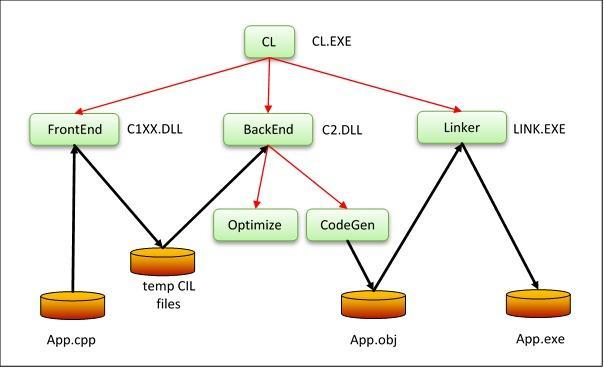 首先我们来看看从命令行开始,编译一个单一文件的程序 APP.cpp 时会发生什么(如果你想从Vistual Studio 来启动编译,下图还必须包含一些高层软件,然而,结束时,它们会给出一些很特别的命令,我后面会讲到)。
