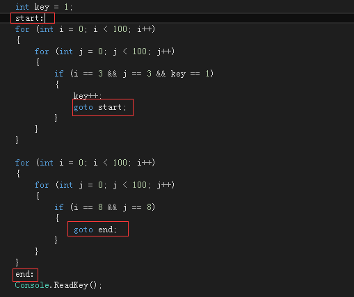 C#中我从来没用过goto。可以说c#中使用goto几乎没有什么优点,唯一的一个明显用途,是跳出双层循环(后面有例子),goto使得跳出双层循环非常方便,否则我们得自己使用一个独立变量来控制跳出双层循环。
