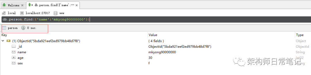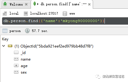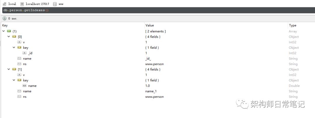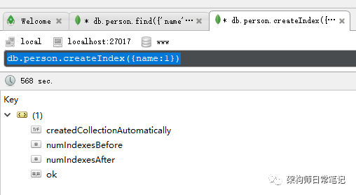 public static void main(String[] args) { try { /**** Connect to MongoDB ****/ // Since 2.10.0, uses MongoClient MongoClient mongo = new MongoClient("localhost", 27017); /**** Get database ****/ // if database doesn't exists, MongoDB will create it for you DB db = mongo.getDB("www"); /**** Get collection / table from 'testdb' ****/ // if collection doesn't exists, MongoDB will create it for you DBCollection table = db.getCollection("person"); /**** Insert ****/ // create a document to store key and value BasicDBObject document=null; for(int i=0;i<100000000;i++) { document = new BasicDBObject(); document.put("name", "mkyong"+i); document.put("age", 30); document.put("sex", "f"); table.insert(document); } /**** Done ****/ System.out.println("Done"); } catch (UnknownHostException e) { e.printStackTrace(); } catch (MongoException e) { e.printStackTrace(); } }获取索引情况