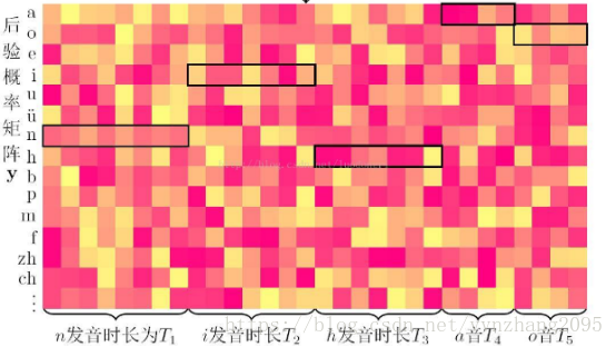 训练后,每一帧输出都有14个音素(音素就是a,o,i,e,u,n,p,...),比如第一帧真实label为n(但注意,如上所述,我们是不知道它是哪个label的),那t=1的时候,我们就用t=1,c=n对应的y;比如第二帧真实label为n,我们就用t=2,c=n对应的y……最后把T个时刻的对应y都乘起来,就得到这个