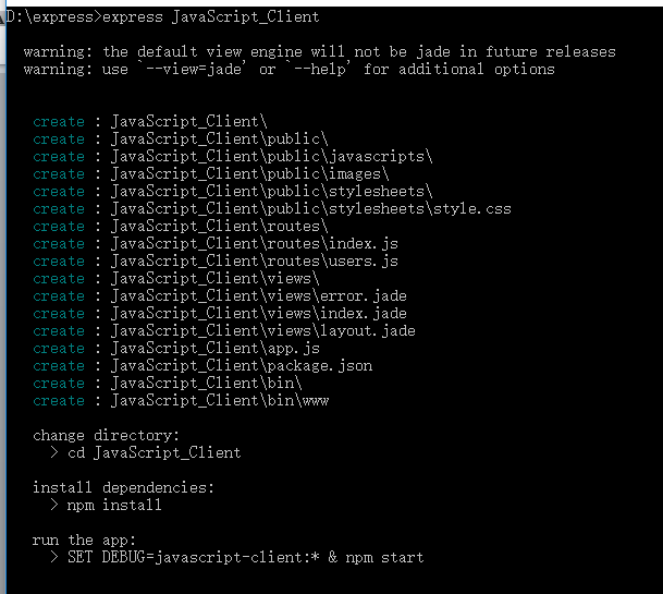输入:express JavaScript_Client 在当前目录下创建一个名为JavaScript_Client的应用。目录结构如下: