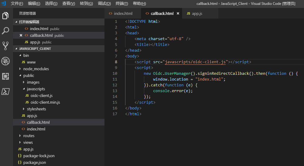 }(4)再新建一个callback.html。一旦用户登录到IdentityServer,这个HTML文件就是指定的redirect_uri页面。它将完成OpenID Connect协议与IdentityServer的登录握手。这里的代码都由我们前面使用的UserManager类提供。登录完成后,我们可以将用户重定向回index.html页面。添加此代码完成登录过程: