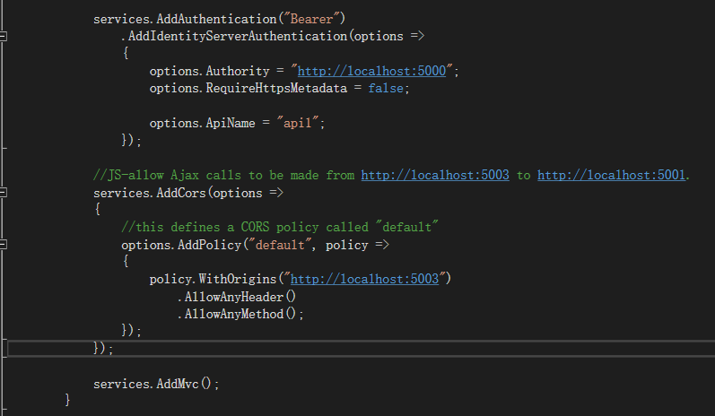 在ResourceAPI项目,打开Startup.cs文件中的ConfigureServices方法,配置CORS,允许Ajax调用从http://localhost:5003调用http://localhost:5001的Web API。