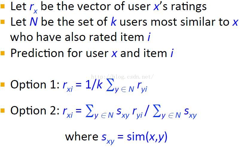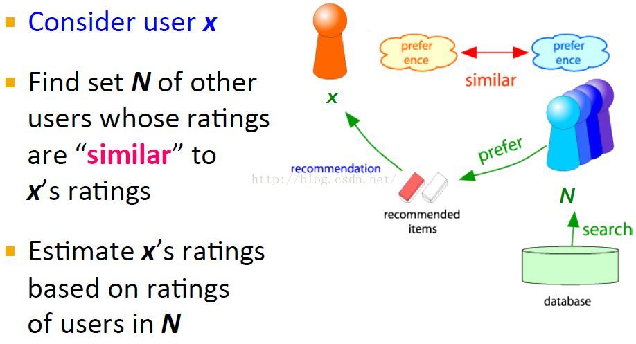 对于一个用户x,首先找到与其相似的一个用户集,这个相似是通过它们的评分rating来判定的,likes和dislikes越相似,他们就越相似。然后推荐这些相似用户集喜欢的items并且预测x评分最高的items给用户x。