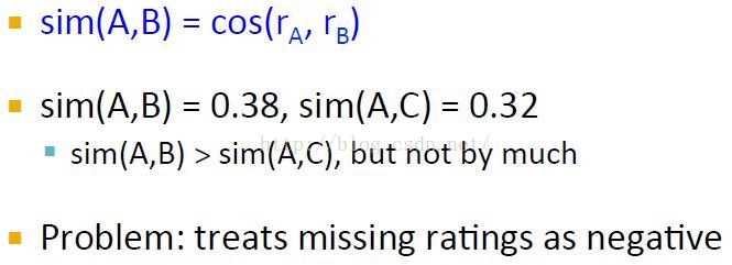 但是由于将缺失值设为0(从上节可以看出评分为0(最小的评分值)实际上是评分为负),也没有揭示出A,B相似度远大于A,C相似度的直觉。