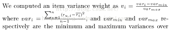 考虑每个item的rating variance。原因是,对某个item如果其评分波动大,也就是不同人有不同意见,这样item对应的评分对于比较两个用户的差异更重要(如一个大家都喜欢的评分都高的Titanic相对于一部评分波动大的恐怖片的重要性可能小些,因为喜欢恐怖片的用户和不喜欢恐怖片的用户其打分肯定相差大)。