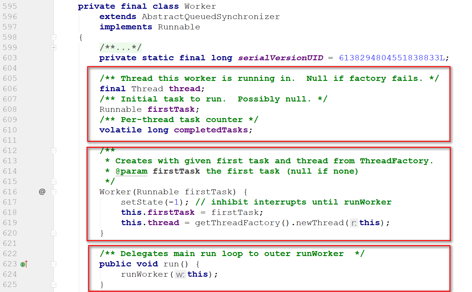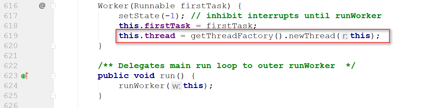 同时,还应该注意到,在构造方法中给thread赋值为一个新线程。由于Worker实现了Runnable接口,也就是说它本身就是可执行的任务,当它启动的时候理所当然应该运行run()方法,而它的run()方法中调用了runWorker(this)方法