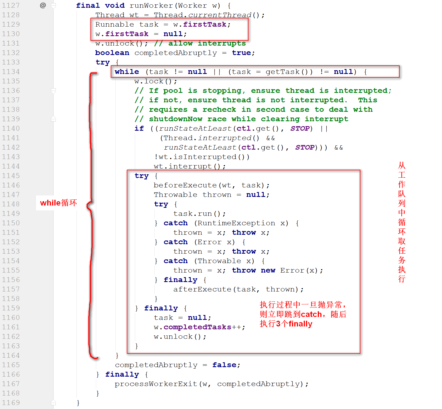 如果task.run()方法抛异常,则会被catch捕捉到,但是catch又将异常抛出去了,外层的两个try没有捕获,跳出循环,执行3个finally