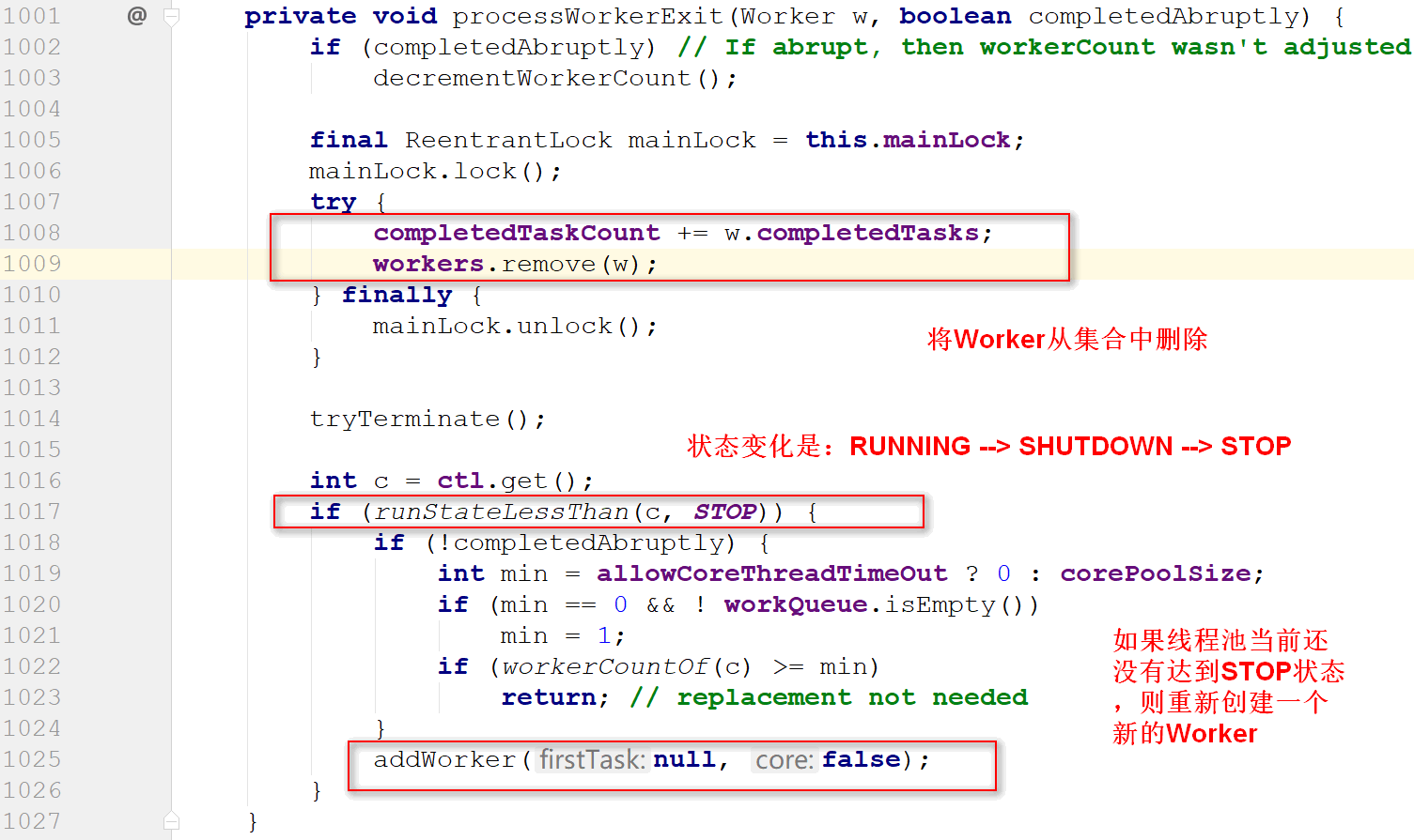 当任务执行失败后,该Workder会被从Worker集合中删除,然后,只要线程池当前还在继续处理任务,则重新创建一个新的Worker