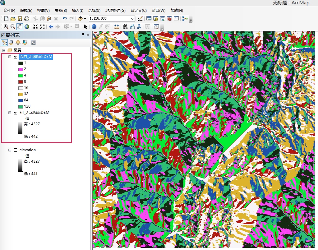 【流向】分析工具很简单,输入一个无凹陷点的DEM,输出结果就是流向栅格。之前也提及过,流向栅格数据是以2的n次方来标记8个方向的,在没有汇的情况下,其数值一定是2的n次方。ArcGIS软件经历了非常多个版本的迭代更新,已经很人性化了,在默认情况下会自动的给定流向栅格8个方位不同的颜色进行渲染。下图利用的就是使用无凹陷点DEM进行流向分析产生的结果: