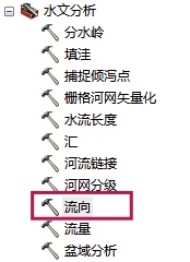 首先流向分析要使用填洼过的数据,确保DEM数据没有凹陷点。如果数据准备妥当,直接使用水文分析工具箱中的【流向】工具进行分析。