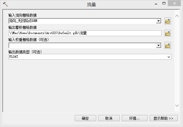 工具调用非常简单,输入流向分析结果的栅格数据,设置好输出的流量统计栅格就行了。如下图所示