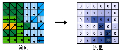 ArcGIS的流量统计是需要流向栅格进行参考的,其统计原理如下图
