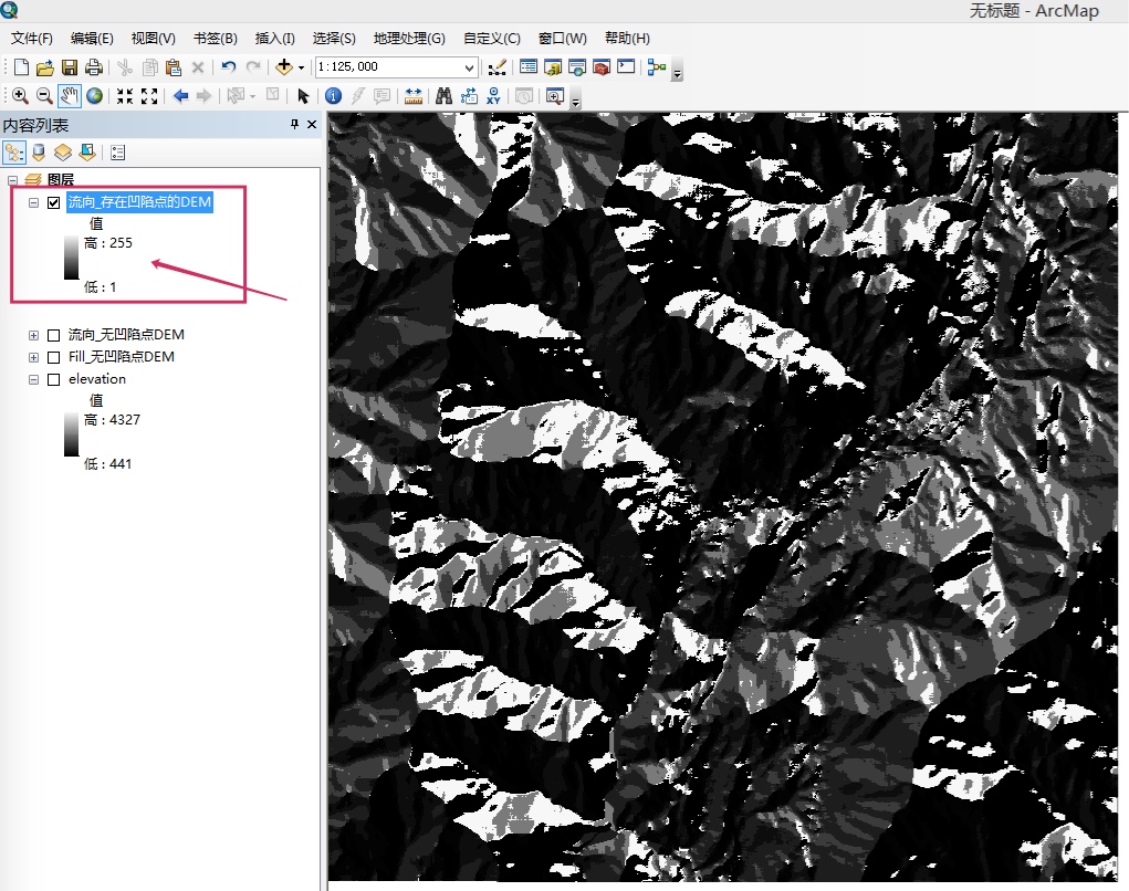 那么在参与进行计算的DEM肯定还存在汇,所以要是遇到上图的这种流向的表达方式,就一定要对DEM做填洼操作,不然整个分析结果都会存在错误。