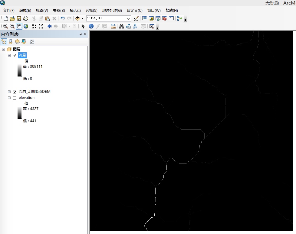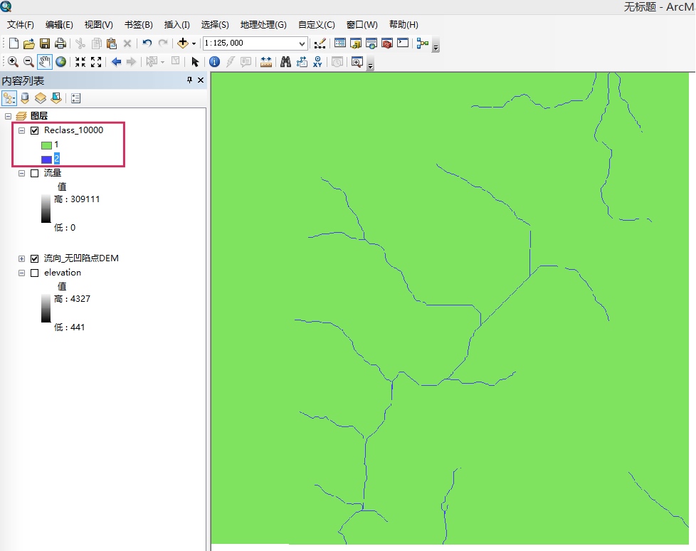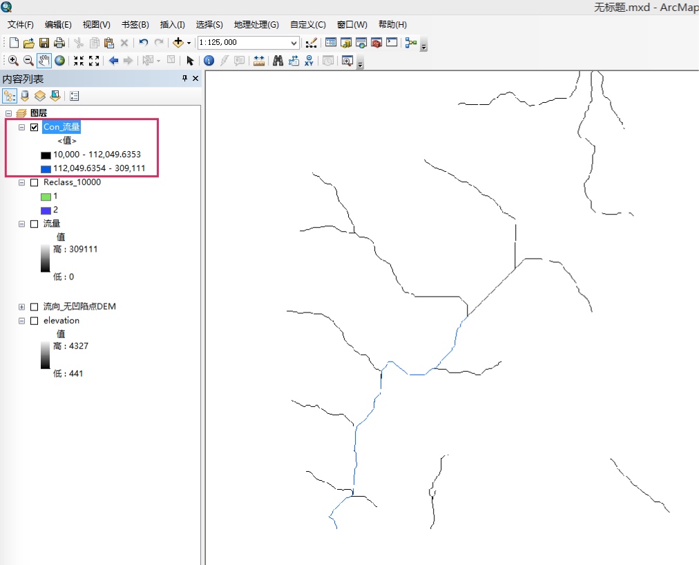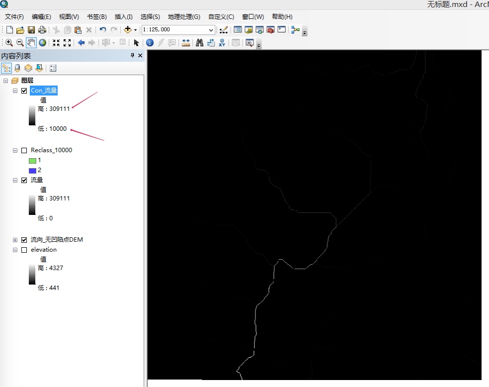 这个结果表面上看起来跟原来的流量统计结果类似,但留意图例部分,其最低值已经发生了变化,也就是说已经剔除掉小于10000像元值的栅格了。如果在显示设置上将其随意分为两类以上,均可以看到栅格像元的组成的河流与前面重分类的河流是温和的,如下图