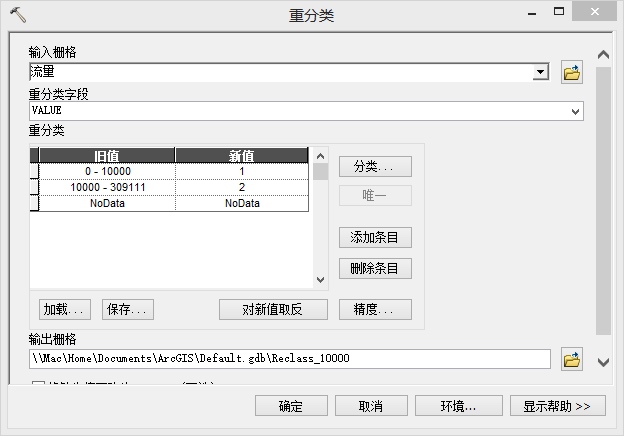 也就是说地表径流能够汇聚成河流的最小蓄积栅格为10000,这样在重分类工具里面基本上可以划分为两类,1类是小于10000栅格数,一类是大于等于10000的栅格数,如下图分类