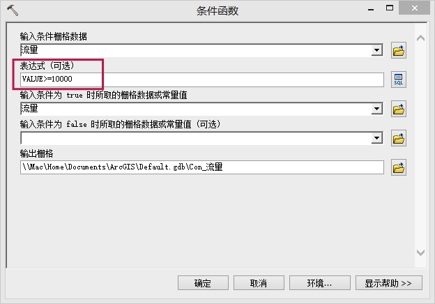 针对流量进行河流的定义,ArcGIS工具对栅格处理还提供了一个更好的工具,可以剔除掉不符好条件的栅格像元,那就是【条件函数】。【条件函数】有点像【筛选】工具,只不过一个是针对栅格数据,一个是针对矢量数据进行过滤,它是针对输入栅格的每个输入像元执行 if/else 条件评估。例如该例子要提取出蓄积量大于10000的流量像元,使用【条件函数】可以如下操作
