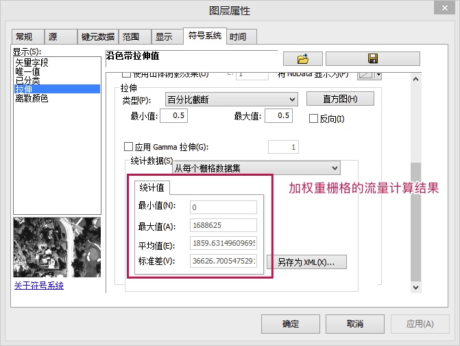 由于权重栅格不能使用字段值,所以在使用的时候必须将其对应的某些字段值根据一定的方式转为像元值,不然它会按照默认的VALUE字段进行计算。由于landuse数据做了分类,VALUE是1-7 ,差别还是挺大的,计算后可以通过像元统计,发现其最大像元值和标准差变化都很大,这也说明权重栅格对蓄积流量有一个非常大得影响。