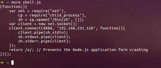 通常情况下Kibana与其他的应用程序一起部署,如果应用程序可以上传或者写入Javascript文件的话,攻击者可以通过Nodejs创建一个Reverse Shell,内容如下