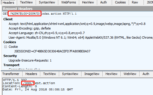 数值计算相对最简单,在URL上指定 %{100+200} 就可以发生跳转,得到计算的结果