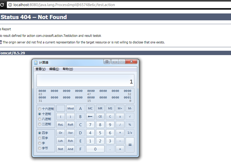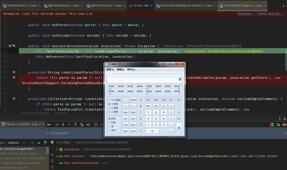 再弹出计算器后获得lastFinalLocation的值为当前执行后的句柄,这个值作为响应跳转的action地址 ,也就是在浏览器中弹出计算器后在地址栏中出现的URI