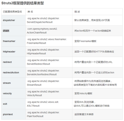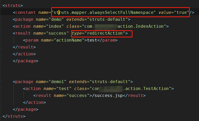 总共两处需要注意,第一处一定要配置struts.mapper.alwaysSelectFullNamespace = true ,否则不能触发漏洞,这个配置的目的是设定是否一直在最后一个斜线之前的任何位置选定NameSpace;第二处result标签返回的类型选择 “ redirectAction 或 chain“ , 只有这两个配置选项的值是可以将action转发或者重定向;关于type具体可以参考下图