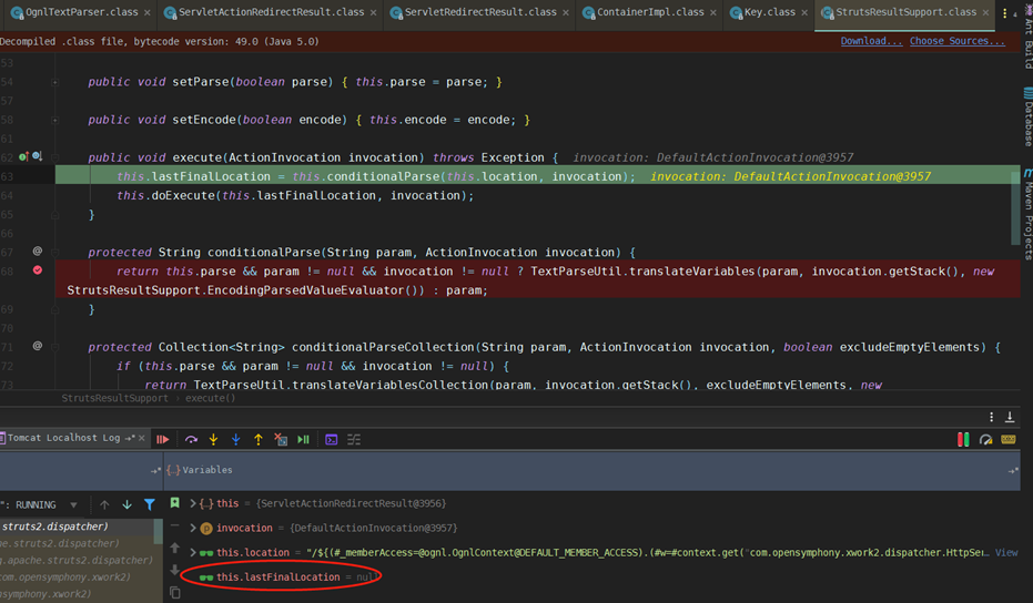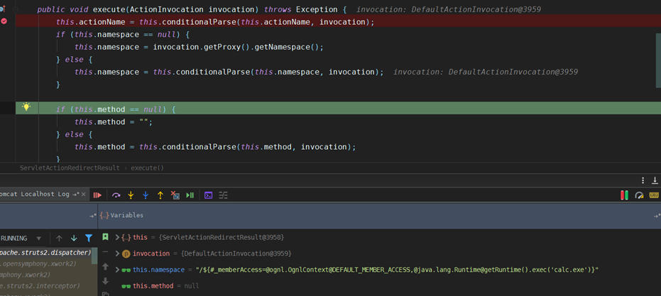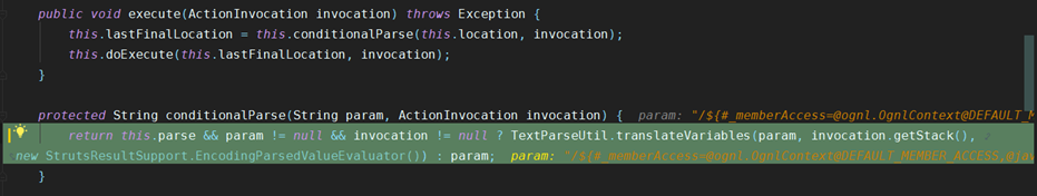 再通过super.execute方法调用了ServletActionResult , 而在execute方法体内跟进了conditionalParse方法,在这个方法内调用了ONGL执行的关键方法translateVariables。