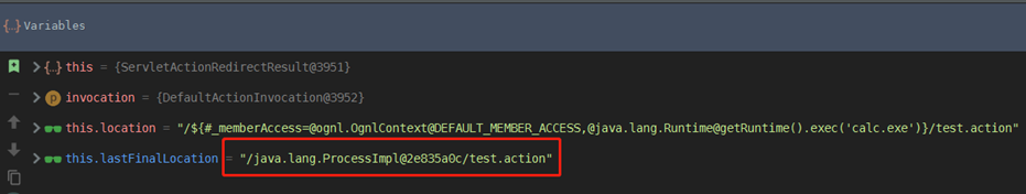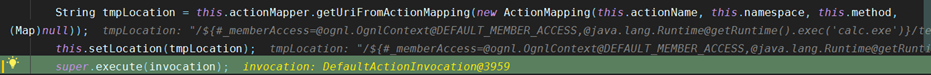 到这里弹出计算器的分析到此为止,接下来看下基于命令执行回显结果的分析,基本上流程和上述一样,唯一不同之处lastFinalLocation返回的值是NULL,这也就引发出提交后没有做302的跳转,依旧是当前的action,并且返回的值是200