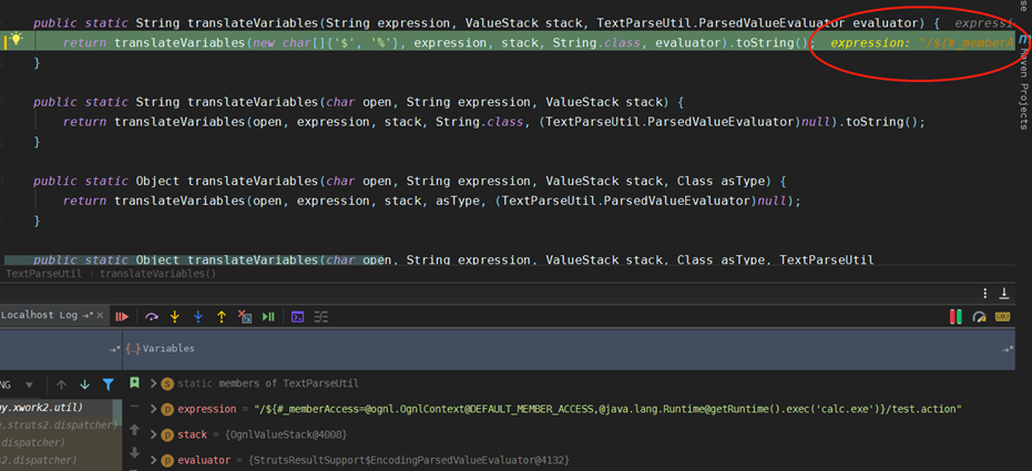 获得的param值传入到translateVariables()方法内,最终在OnglTextPaser里导致了OGNL表达式执行。