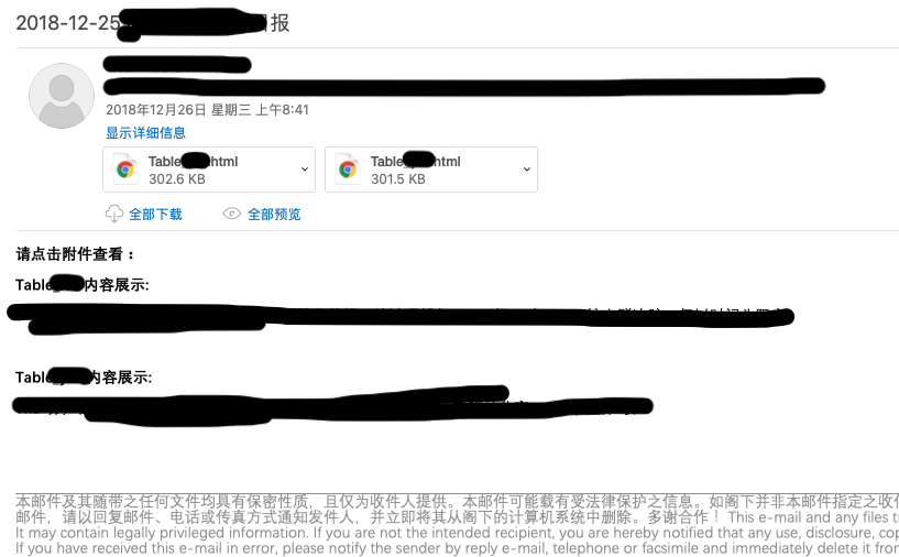 在电脑端一切正常,还有点小激动,毕竟比csv下载再查看的体验好多了。正当我已熟悉这种模式,将所有类似任务都转化为附件+说明的方式的时候,一封发给大boss的自动报表敲醒了我,大佬们不按套路出牌,拿手机看邮件,结果我就被冠以给领导发木马的罪名。冷静下来,也不冤,的确是在开发过程中没有考虑用户的使用习惯、平台兼容性。