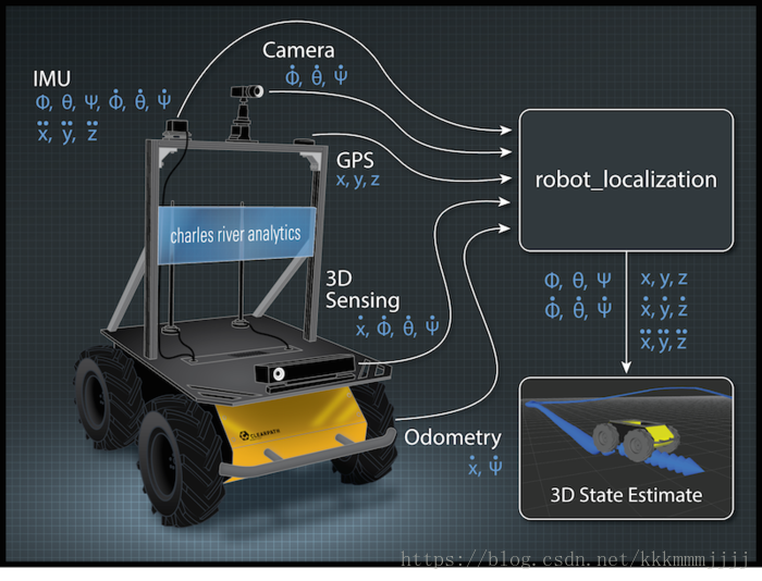 任意数量的传感器数据融合。节点不限制输入传感器的数量,比如机器人具有多个IMU或机器人里程计信息,robot_localization中的状态估计节点可以支持所有的传感器。
