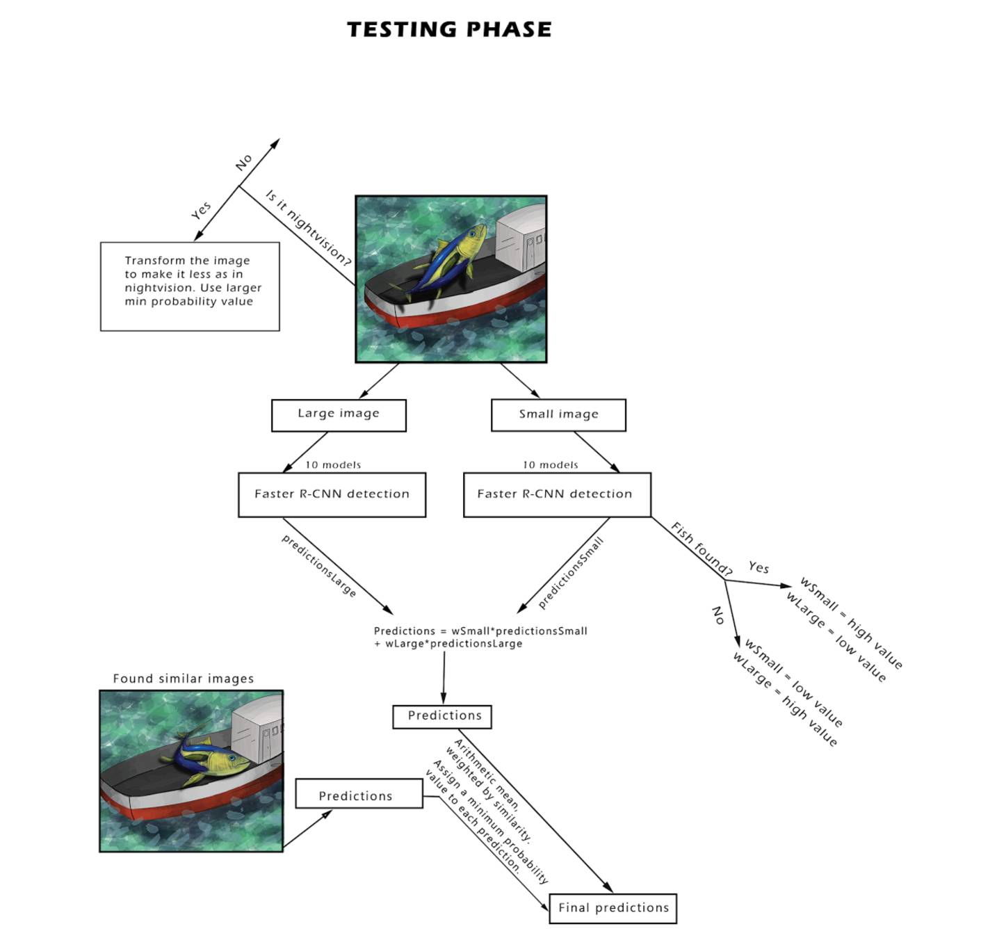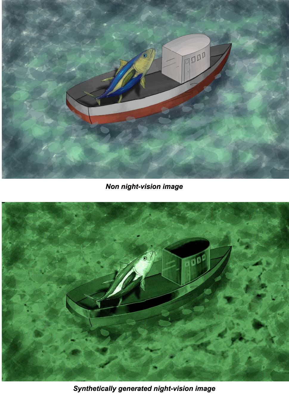 因为这个模型性能非常好,如果添加一个不单独使用夜视图像的模型,但却会加长所有图像的对比度。因为这是分别在每个通道上完成的,可能会改变鱼类或周围环境的颜色。由于数据中海洋里光照条件变化多端,真实图像中的颜色不太稳定,所以这种方法结果看上去还是很好的。